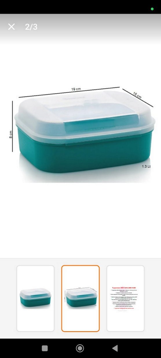 Tupperware 1.3 litre kapasiteli, turkuaz renkli ve saydam kapaklı saklama kabı. Ölçüleri 19x15x8 cm'dir.