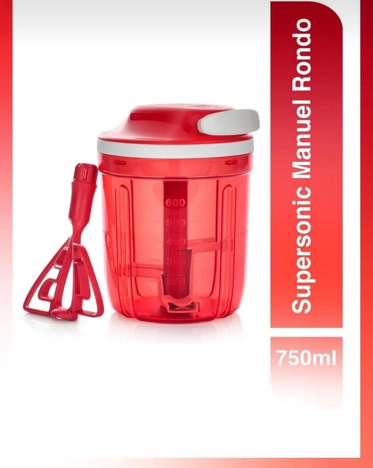 750ml kapasiteye sahip kırmızı manuel rondo, kolay kullanım için saplıdır. Çok amaçlı çırpıcı aparatıyla birlikte gelir.