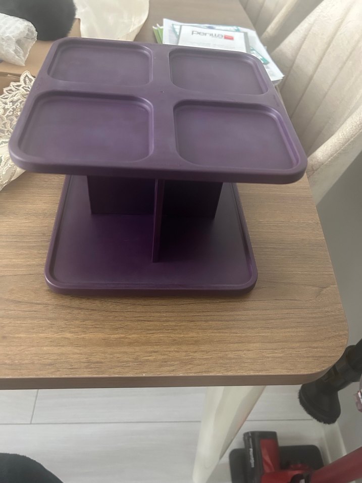 Mor plastikten yapılmış, üstte dört bölmeli ve sağlam tabanlı mutfak düzenleyici. ️