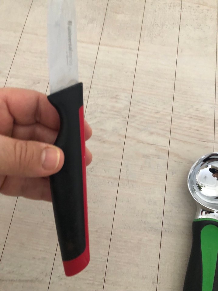 Kırmızı detaylı koyu renk saplı, kullanımı rahat bir domatez bıçağı.