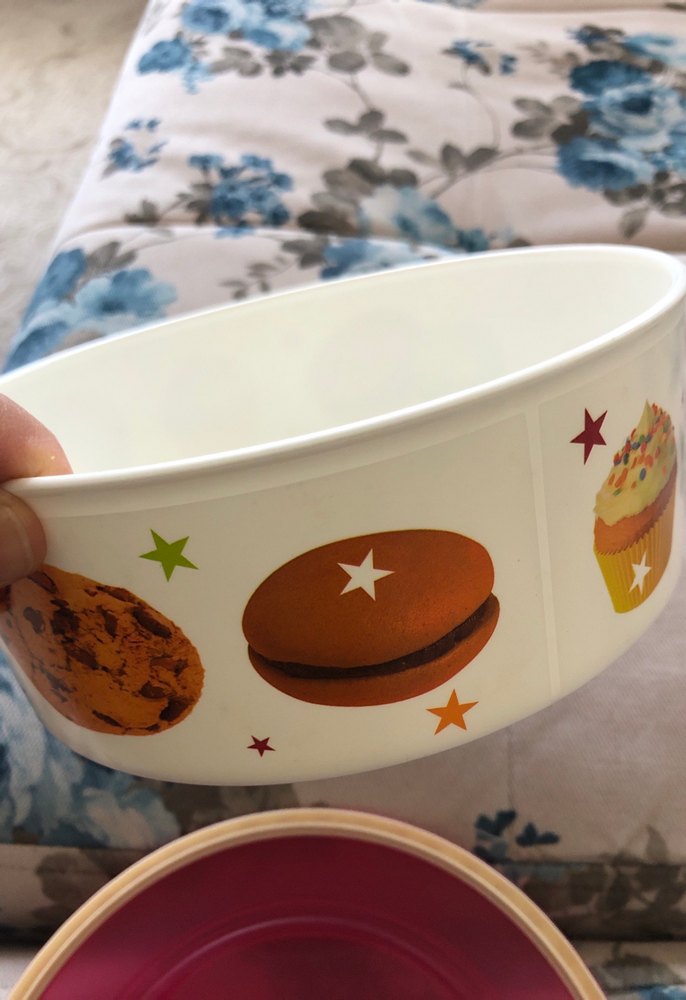 Üzerinde kurabiye, kek ve yıldız desenleri bulunan beyaz plastik kase. Mutfak eşyalarınıza renk katar.