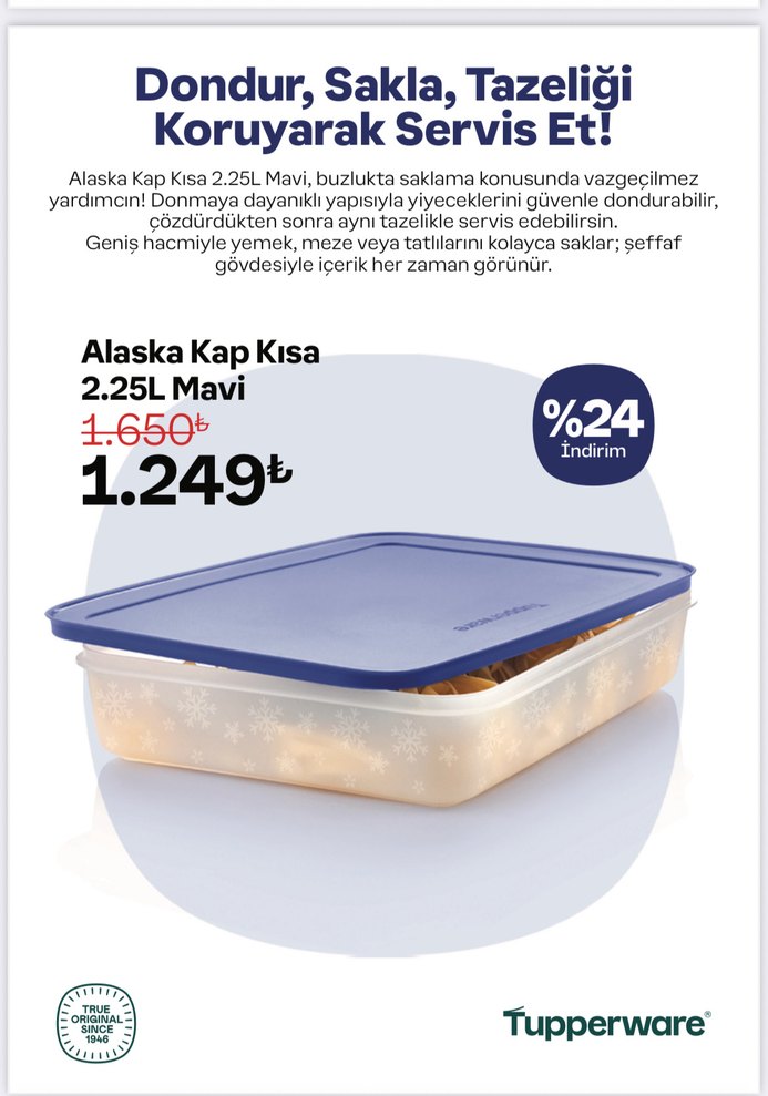 Tupperware mavi Alaska Kap Kısa 2.25L, dayanıklı yapısıyla buzlukta saklama için uygundur. Şeffaf gövdesiyle içindekiler kolayca görünür, çözdürdükten sonra tazeliğini korur. ❄️