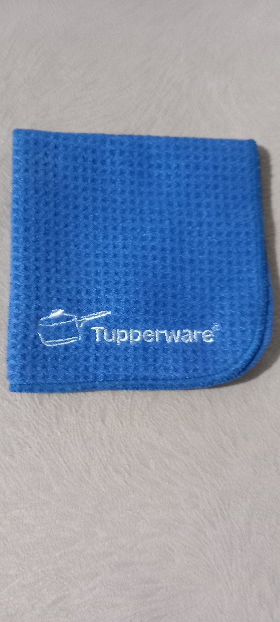 Mavi renkte, dokulu yapıya sahip Tupperware mutfak bezi, işlemeli logo ile mutfakta etkili kurutma ve temizlik sağlar.
