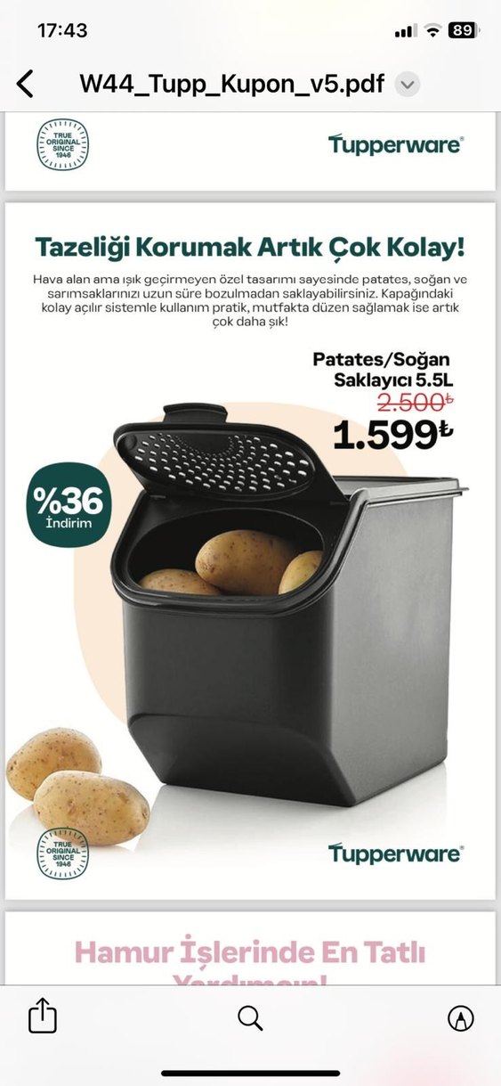 Hava alan ama ıslaklık geçirmeyen özel tasarımlı siyah Tupperware saklayıcı, 5.5L kapasite ile patates, soğan ve sarımsağı uzun süre taze tutar. Kolay açılır kapaklıdır.