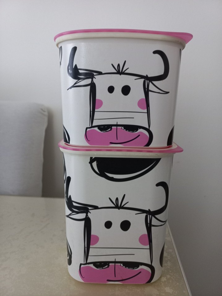 Pembe kapaklı, renkli plastik saklama kapları, üzerinde eğlenceli inek deseni bulunur. Mutfakta kullanıma uygundur. 2 li set olarak vakumlu sıkı kapaklı su serisi.kullanıma bağlı hafif çizikleri dışında sorunu yok. 2.1 litre 1.3 litre