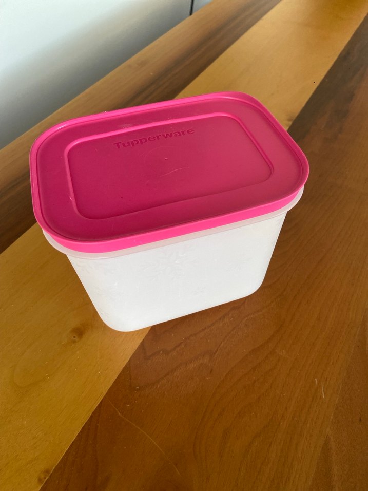 Tupperware marka, pembe kapaklı ve beyaz tabanlı saklama kabı, yiyecekleri güvenle muhafaza etmek için uygundur.