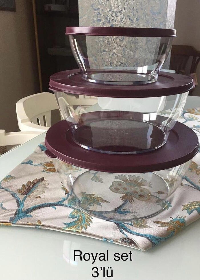 Tupperware’in en güzel ve klas ürünlerinden royal set. Saklama ve servise uygundur. Cam görünümlü olmasından dolayı en şık sofralarda yerini alır. İç içe girebilir ve dolapta fazla yer tutmaz Set fiyatıdır 1 adet 4 lt 1 adet 2.4 lt 1 adet 1.3 lt Orijinal sıfır üründür