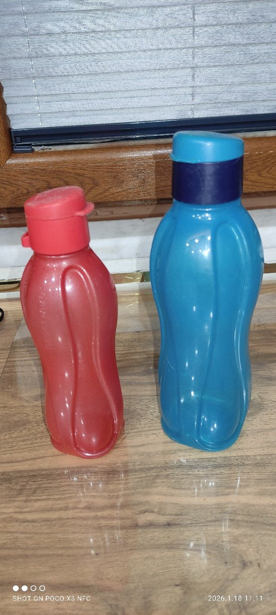 Mavi ve kırmızı renkli, güvenli kapaklı plastik mutfak şişeleri. Sıvı saklama için uygundur. tupperware suluk