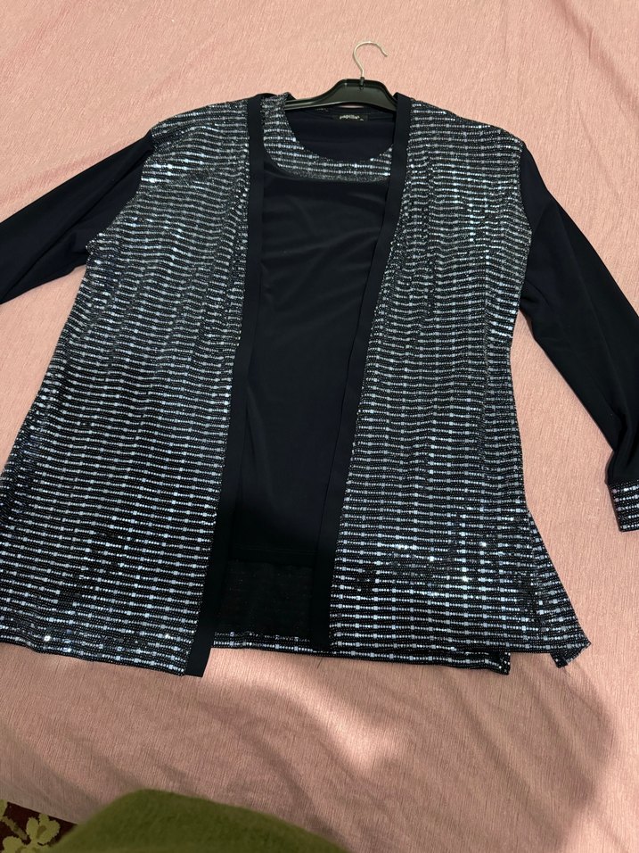 İçteki bluz krep kumaş kısa kollu dıştaki yelek palet uzun kol detayları resimlerde.Paletli krep kumaş renk göründüğü gibi temiz bi iki kez giyildi 50-52 beden içi uygundur