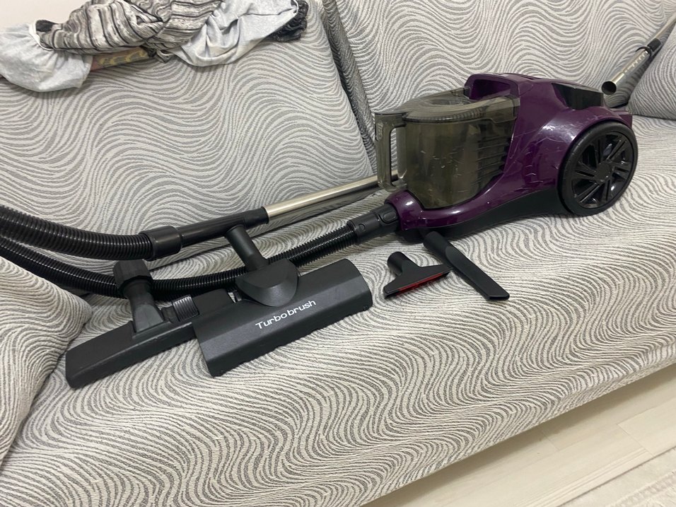Turbo fırçalı ve çeşitli başlıkları olan koyu mor renkli elektrikli süpürge. Kompakt tasarımı kullanım kolaylığı sağlar. Çekimde hiçbir sorun yoktur başka model almak için satıyorum kullanıma bağlı çizikler var gorselde mevcuttur