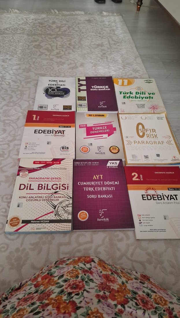 Türk Dili ve Edebiyatı üzerine AYT sınavına hazırlık için paragraf, dil bilgisi ve Cumhuriyet Dönemi edebiyatı konularını içeren soru bankası ve deneme kitapları seti.