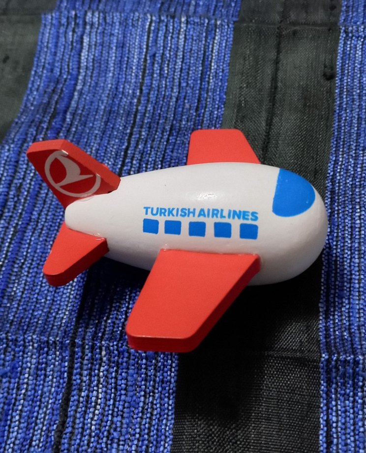 Mavi burunlu ve kırmızı kanatlı, üzerinde Türk Hava Yolları logosu ve yazısı bulunan renkl boy:8 cm kolleksiyon oyuncak uçak. ✈️