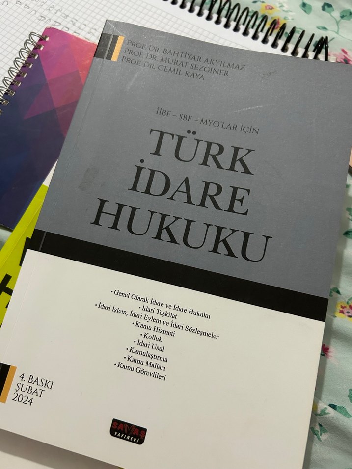 Türk idare hukukunu genel esasları, idari işlemler, kamu hizmeti ve görevleriyle anlatan 2024 tarihli 4. baskı kitap.