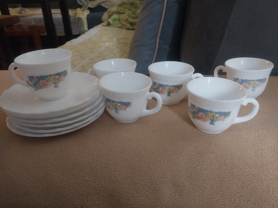 Yanlarında çiçek desenleri olan beyaz porselen fincan takımı, kulplu ve uyumlu tabaklarla birlikte. Sıcak içecekler için uygundur. ☕