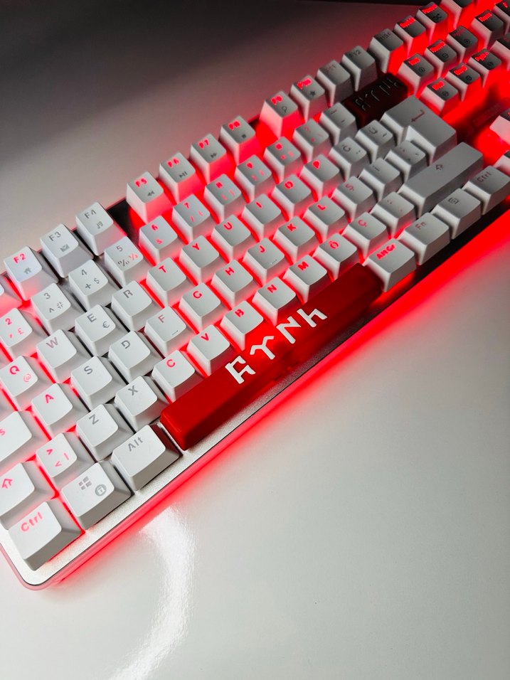 Beyaz tuşlara ve kırmızı ışıklı tabana sahip, boşluk çubuğunda özel semboller bulunan renkli bir klavye. Canlı arka aydınlatma sunar. ⌨️