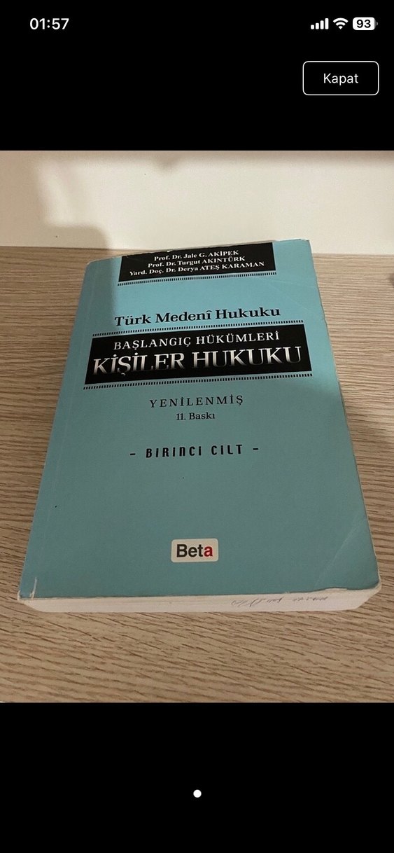 Beta yayınevinden Türk Medeni Hukuku Başlangıç Hükümleri ve Kişiler Hukuku konularını içeren yenilenmiş 11. baskı, birinci cilt.