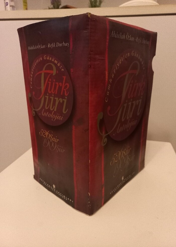 Cumhuriyet'ten günümüze Türk şiiri antolojisi. 1. ciltte nemlenmeden kaynaklı dışında hafif bir kararma vardır.