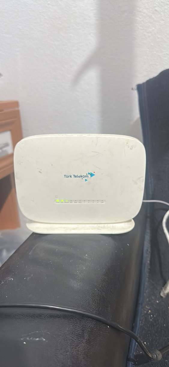 Önünde ışıklı göstergeleri ve Türk Telekom logosu bulunan beyaz yazıcı. Üzerinde 'Turk Telekom' optik karakter tanıma özelliği mevcuttur. ️ wi-Fi modem aktif bir şekilde çalışmaktadır