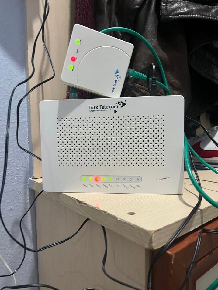 Turk Telekom logosu bulunan beyaz modem ve üzerinde ışıklı küçük cihaz, kablolarla bağlı. Modem üzerinde havalandırma delikleri ve durum ışıkları var.