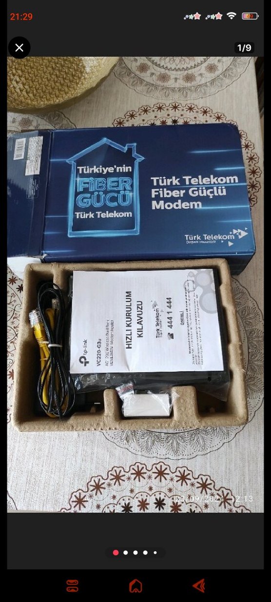 Türk Telekom Fiber Güçlü modem, koyu gri renkte, kablolar ve hızlı kurulum kılavuzu ile birlikte gelir. Fiber internet bağlantılarını destekler.