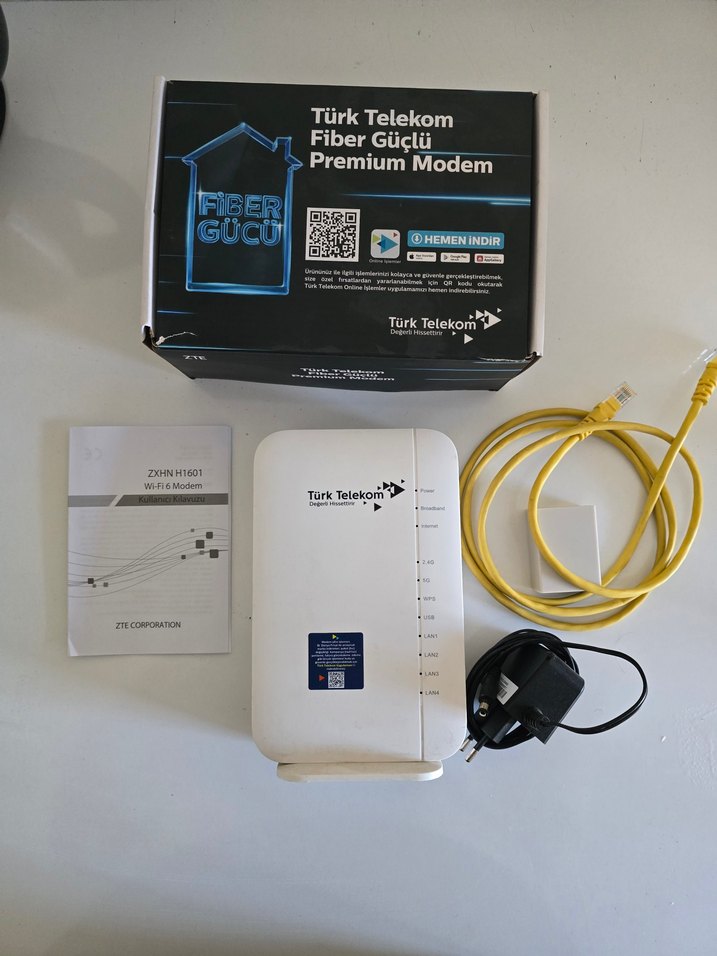 Beyaz ve gri renkli Türk Telekom modem, güçlü fiber bağlantı desteği sunar. Güç adaptörü, Ethernet kablosu ve kullanım kılavuzu ile birlikte gelir.