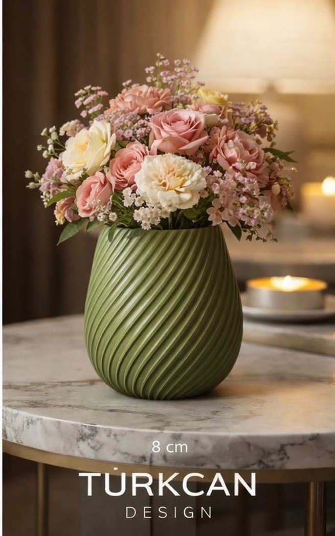 8 cm boyunda, yeşil spiral desenli vazoda pastel pembe çiçek aranjmanı. Mekâna yumuşak ve şık bir dokunuş katar.