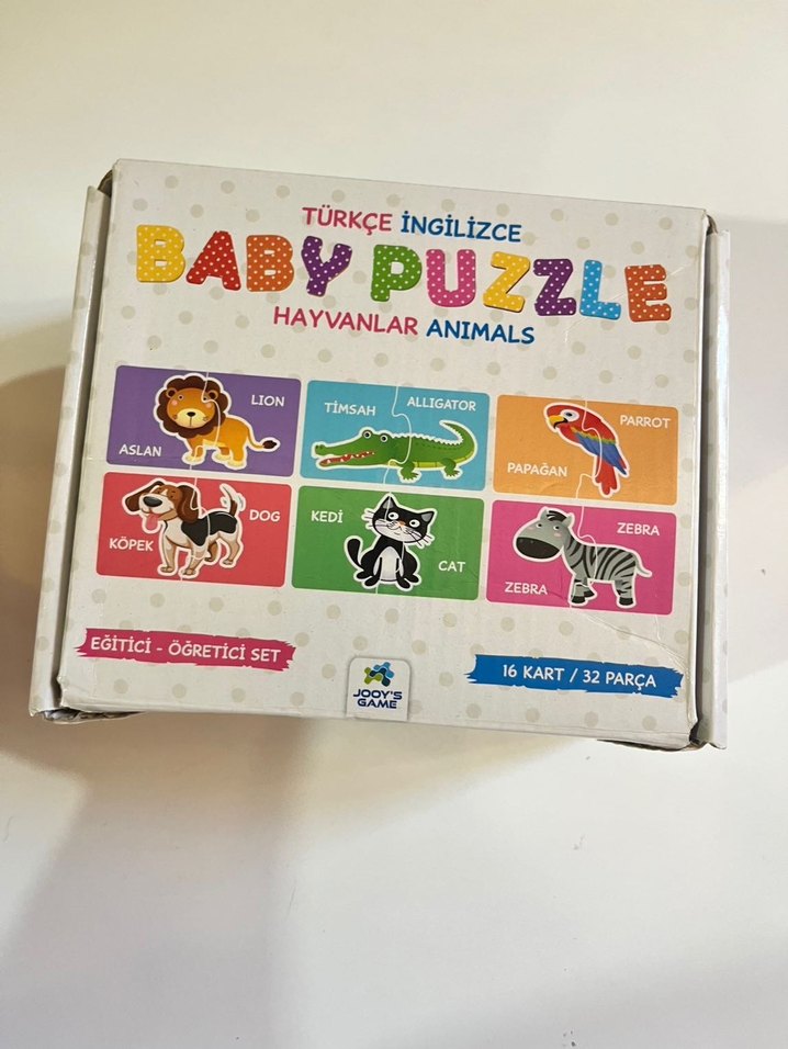 16 kart ve 32 parçadan oluşan bu eğitici set, hayvan isimlerini Türkçe ve İngilizce olarak öğretir. Çocuklar için çift dilli öğrenme oyuncağıdır. 16 set 32 parça bi tarafı türkçe bi tarafı ingilizce hayvanlar egtici set. Kaplumbaga da deforme var fotoda görüldüğü gibi. Seti alana eva meslek bide robot puzzle var o iki seti hediye olarak yollıyacagım. Robotun 2 parçası eksik