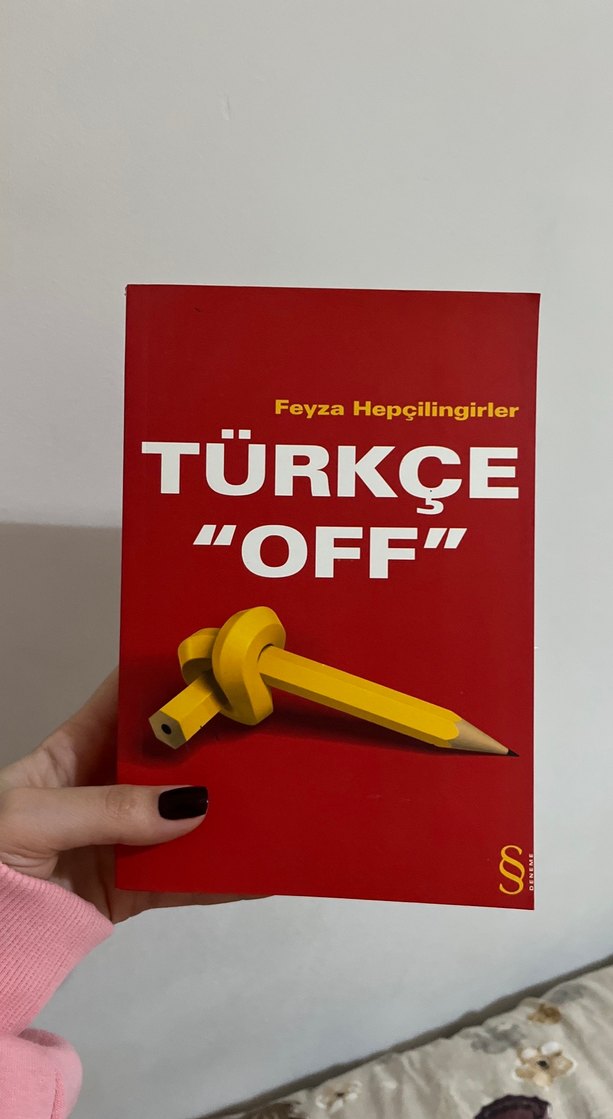 Feyza Hepçilingirler'in "Türkçe 'OFF'" kitabı, kırmızı kapakta düğümlenmiş sarı bir kalem görseliyle dikkat çekiyor. Defosuzdur