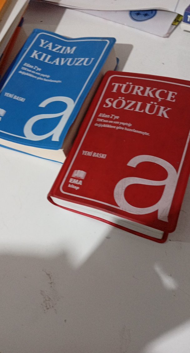 Türkçe sözlük ve yazım kılavuzu seti, kırmızı ve mavi kapaklı, okunması kolay kitaplardan oluşur. yeni basımdır Türkçe sözlüğün arka kapağında siyah şeyler vardır sorun yaratmazsa satın alabilirsiniz