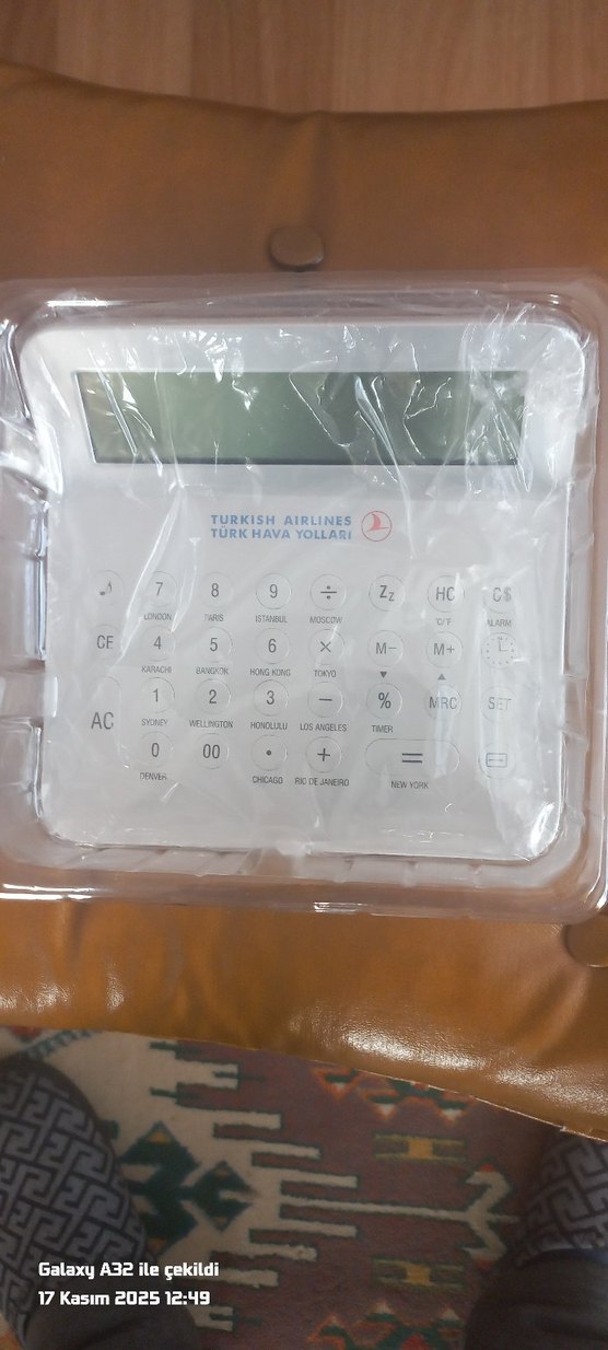 Türk Hava Yolları logosu ve çeşitli şehir isimleri bulunan, açık renkli dijital hesap makinesi.
