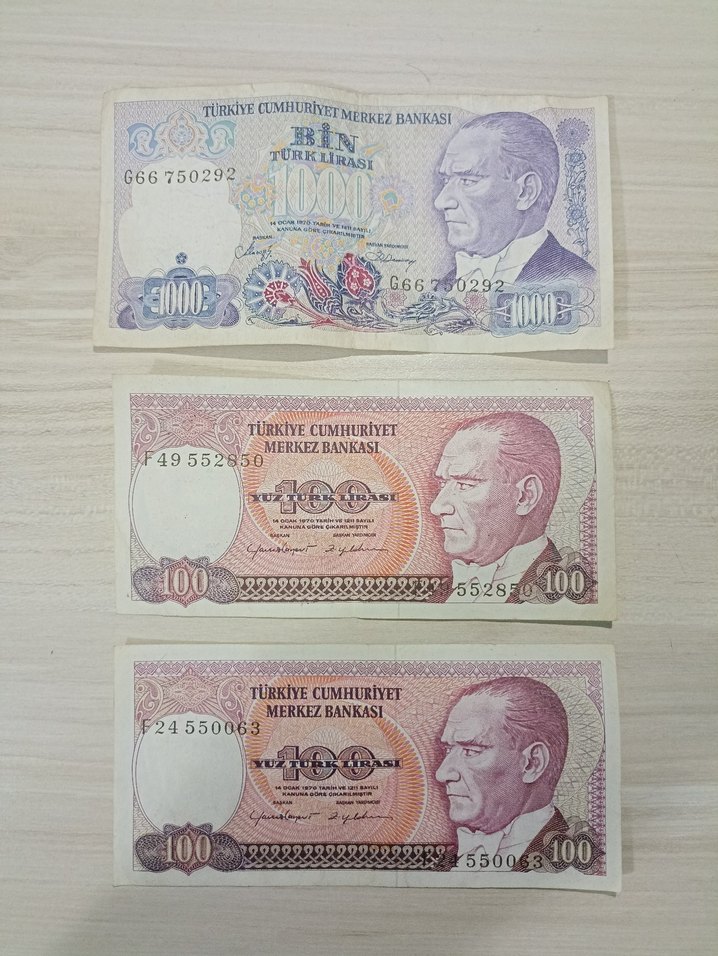 Mustafa Kemal Atatürk portreli 1000 ve 100 lira değerlerinde üç adet eski Türk banknotu seti.