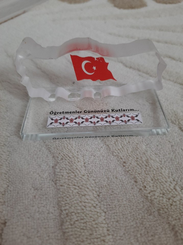 Türkiye haritası şeklinde kristal plaket, üzerinde Türk bayrağı ve "Öğretmenler Gününüzü Kutlarım" yazısı bulunur.