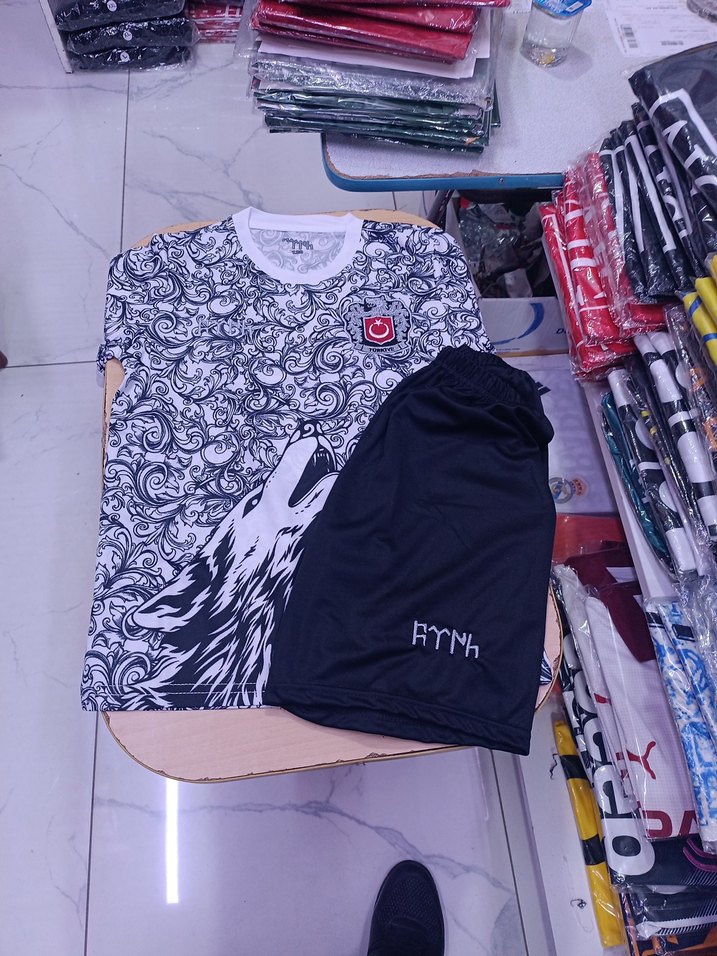 Beyaz ve gri renklerde, baskılı desenli, kısa kollu, gevşek kesim, yuvarlak yaka, örme sentetik kumaştan erkek tişörtü.