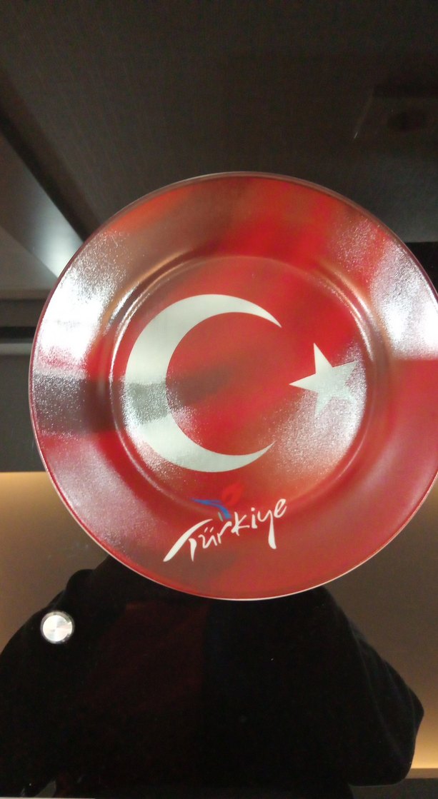 Ay ve yıldız figürlü Türk bayrağı tasarımlı kırmızı tabak, üzerinde 'Türkiye' yazısı bulunur.