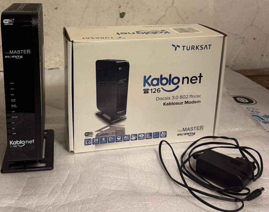 Turksat Kablonet modem, Docsis 3.0 ve 802.11n/ac desteğiyle koyu siyah renkte. Kararlı internet bağlantısı için çeşitli özellikler sunar. Ürün kutulu ve hiç kullanılmadı