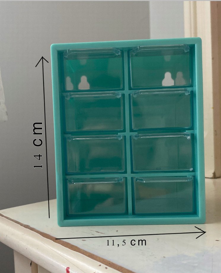 14 cm x 11,5 cm ölçülerinde, kapağı şeffaf 8 bölmeli turkuaz dolap düzenleyici. ️