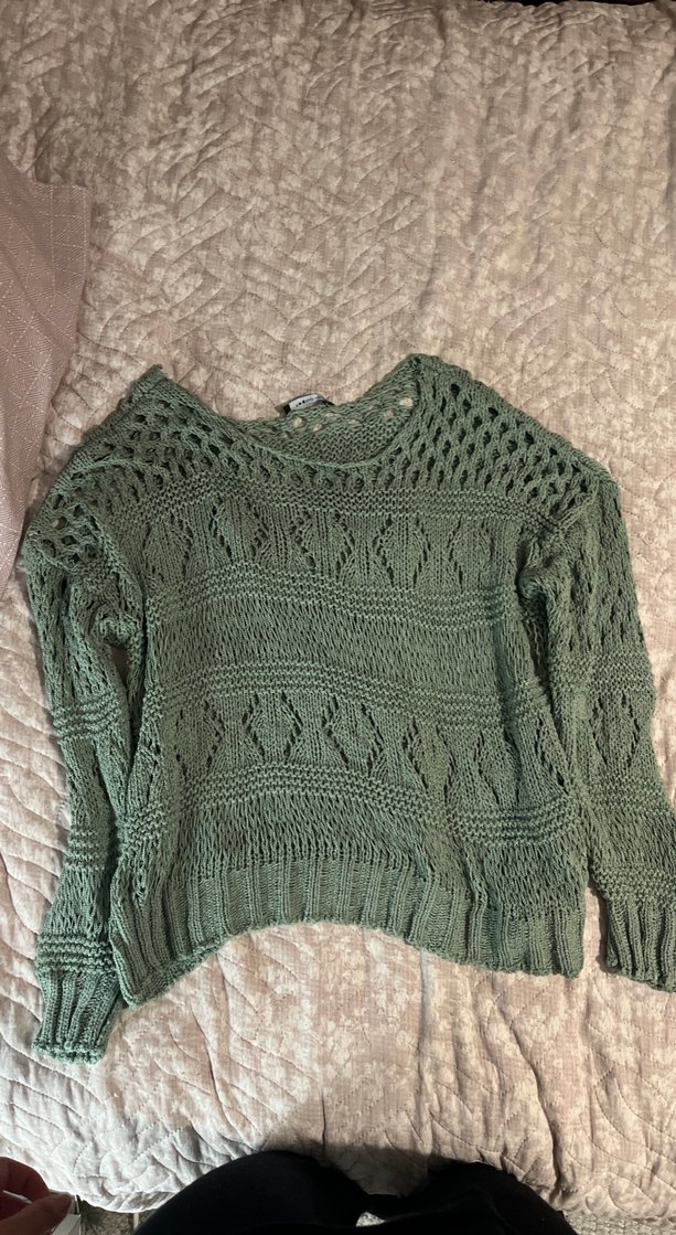 Trendyolmilla turkuaz-yeşil tonlarda, örgü kumaştan, bol kesim ve kayık yaka detaylı kadın kazak. Bir kere giyildi.