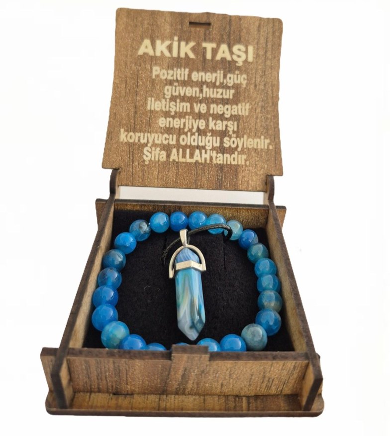 Koyu turkuaz renkli bohem tarzında tesbih, pozitif enerji ve koruyucu etkisi olduğu söylenen akik taşı ucu ile birlikte ahşap kutuda sunulur.