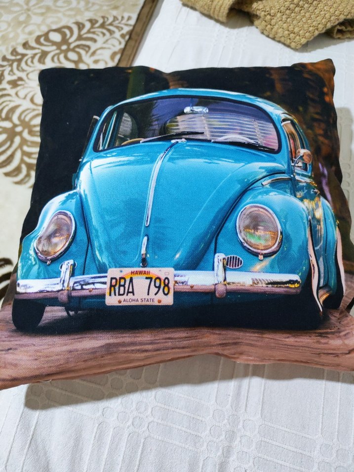 iki adet Turkuaz renkli oyuncak araba desenli yastık, üzerinde RBA 798 plakası bulunan renkli klasik araba resmiyle.
