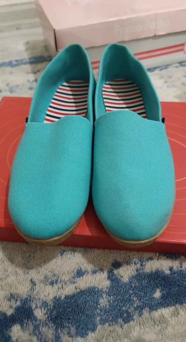 Turkuaz renkli babet hiç giyilmedi sadece önü başka bir ayakkabıdan toz olmuş 38 numara