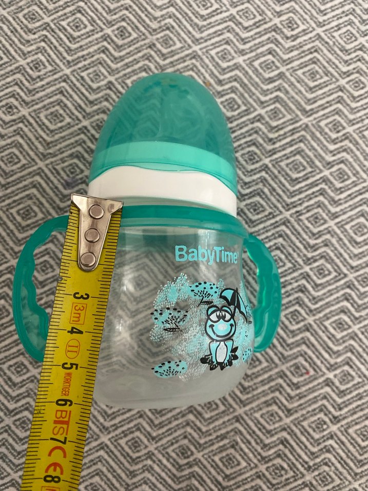 Turkuaz renkli BabyTim bebek biberonu, renkli kulpları ve güvenli kapağı ile kullanıma uygundur. Üzerinde çizgi film karakteri bulunur. #biberon #babytime