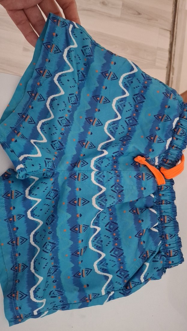Turkuaz renkli, renkli batik desenli erkek çocuk mayo şortu. Ayarlanabilir turuncu bağcık ve yumuşak, çabuk kuruyan kumaş içerir. temiz