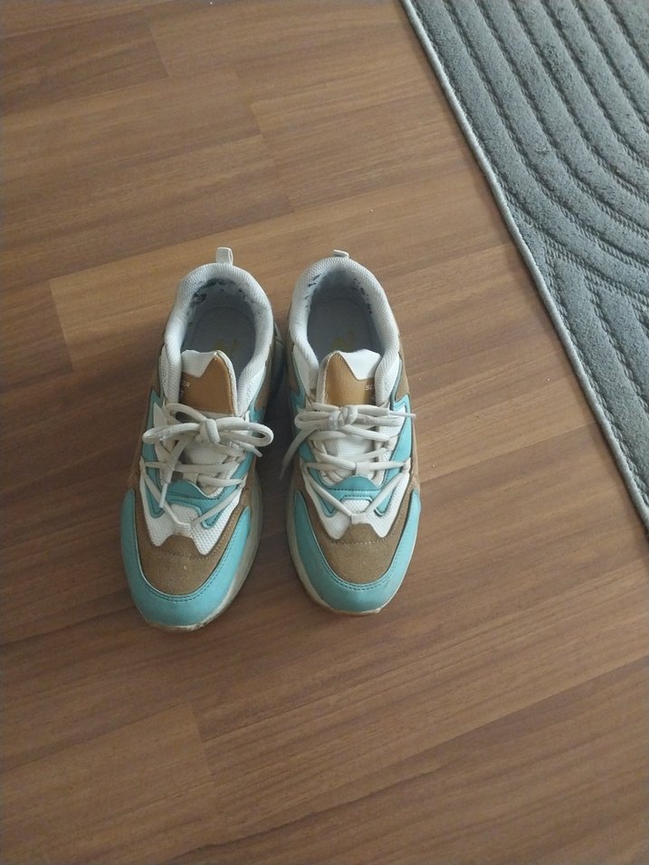 Turkuaz renkte, bağcıklı kadın spor ayakkabısı. Dolgu topuklu ve kauçuk tabanlı, pastel tonlarda sokak modasına uygun.