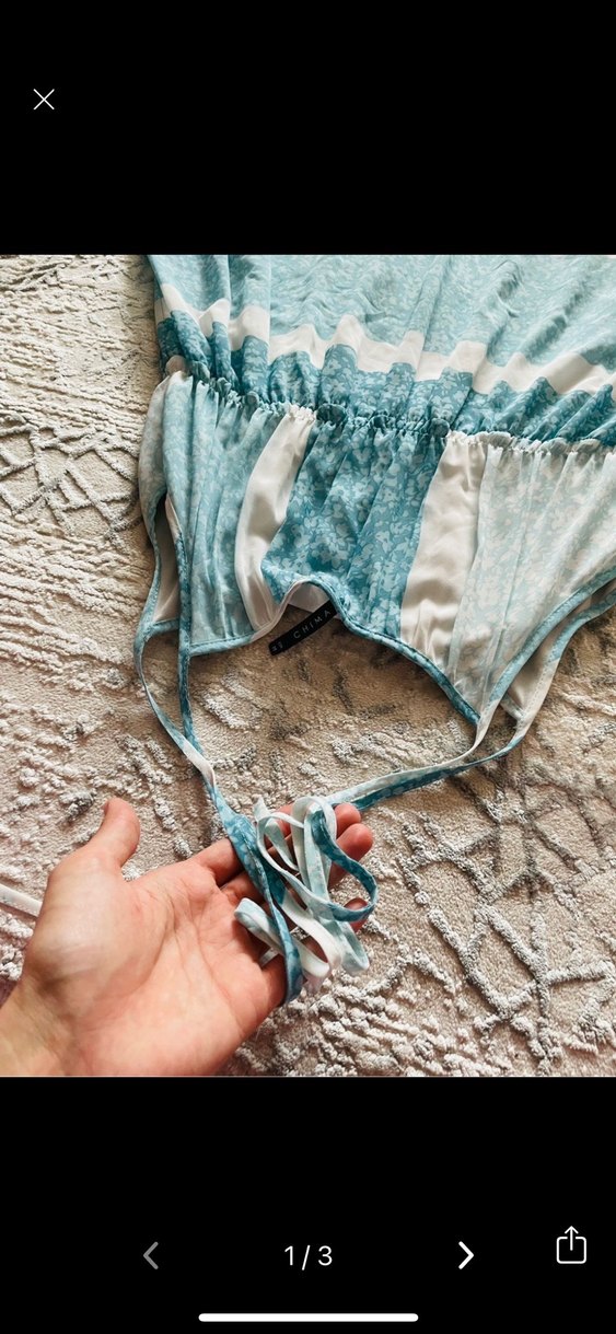 Turkuaz pastel tonlarda, bağcıklı askılı, mini uzunlukta, bol kesim elbise. iade kabul edemiyorum.