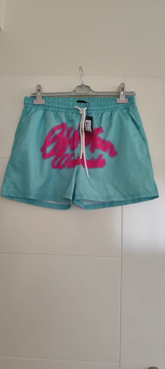 Bağcıklı beli ve pastel turkuaz renkte, rahat kesimli erkek mini şort. Plajda rahat ve şık bir görünüm sunar.