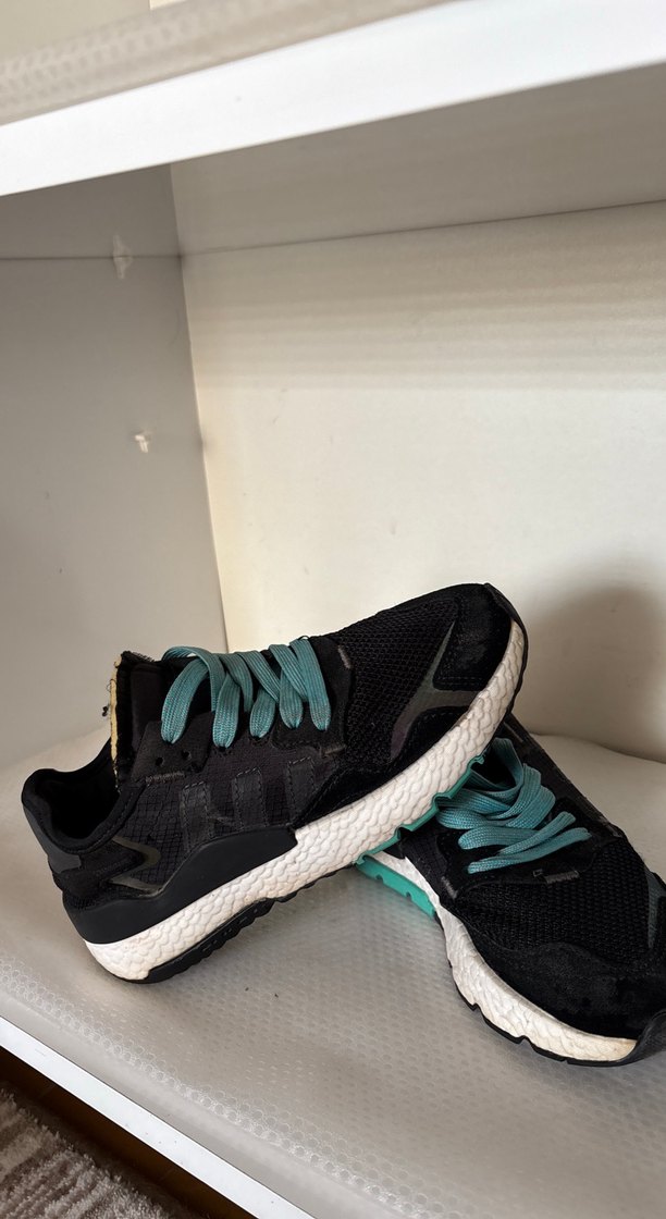 Turkuaz bağcıklı, siyah tabanlı kadın spor ayakkabısı. Spor ve sokak tarzı için uygun, dayanıklı kauçuk tabanlı şık tasarım.