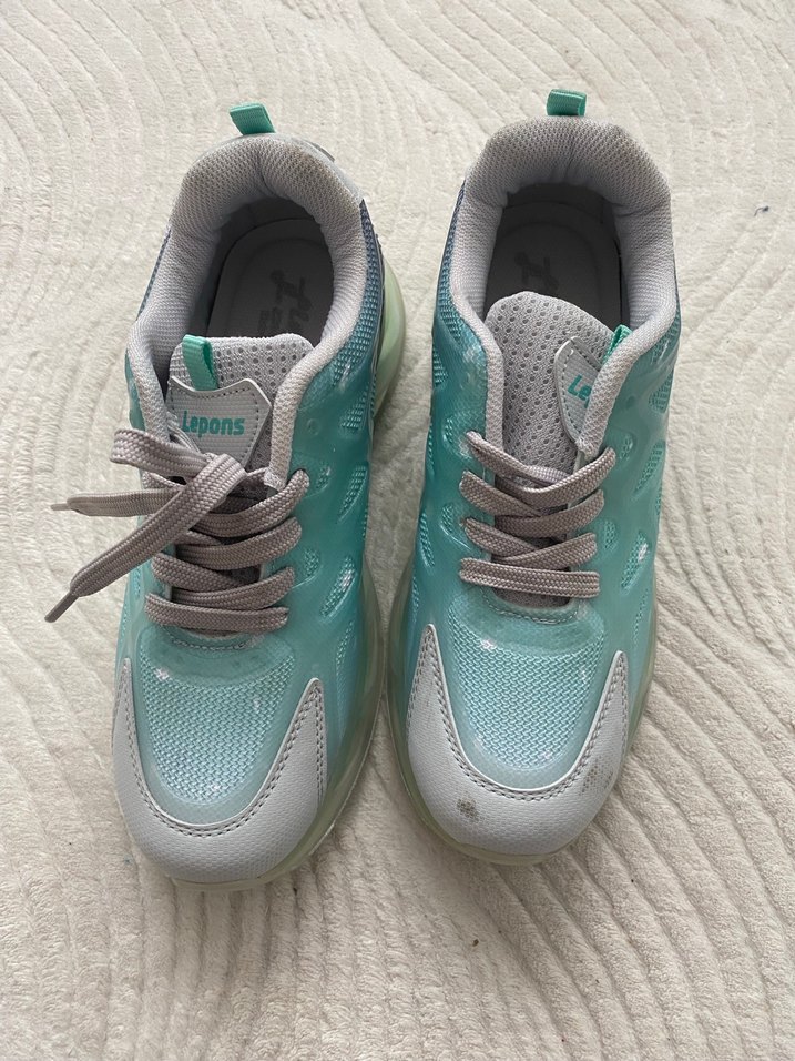 Pastel turkuaz bağcıklı, batik desenli kadın spor ayakkabısı. Lastik tabanlı, stiletto topuklu ve sokak stili için uygun.etiketi yok ama sıfır üründür