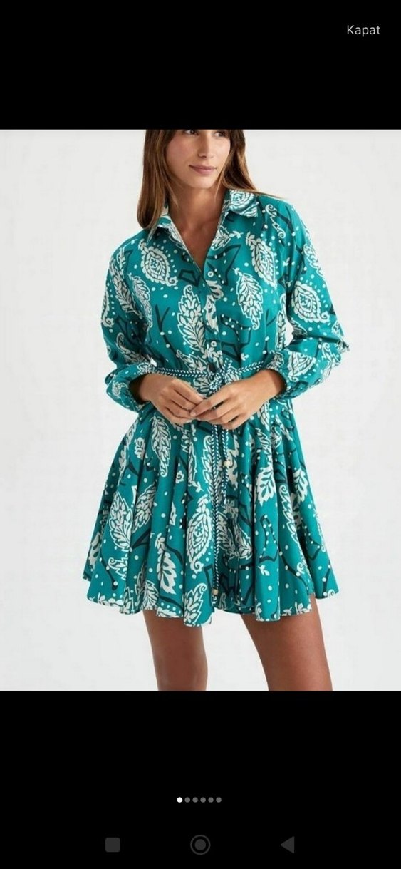 Turkuaz renkli, uzun kollu, V yakalı mini elbise. Bağcıklı bel detayı ve salaş kesimiyle rahat bir bohem tarz sunar.
