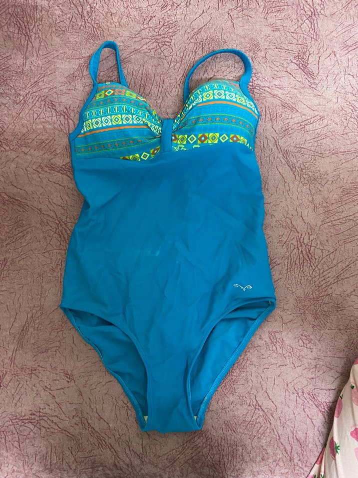 Bağlamalı askılı, turkuaz renkli, bağlamalı desenli ve fermuarlı detaylı kadın mayo. Bohem tarzıyla plajda kullanıma uygundur.