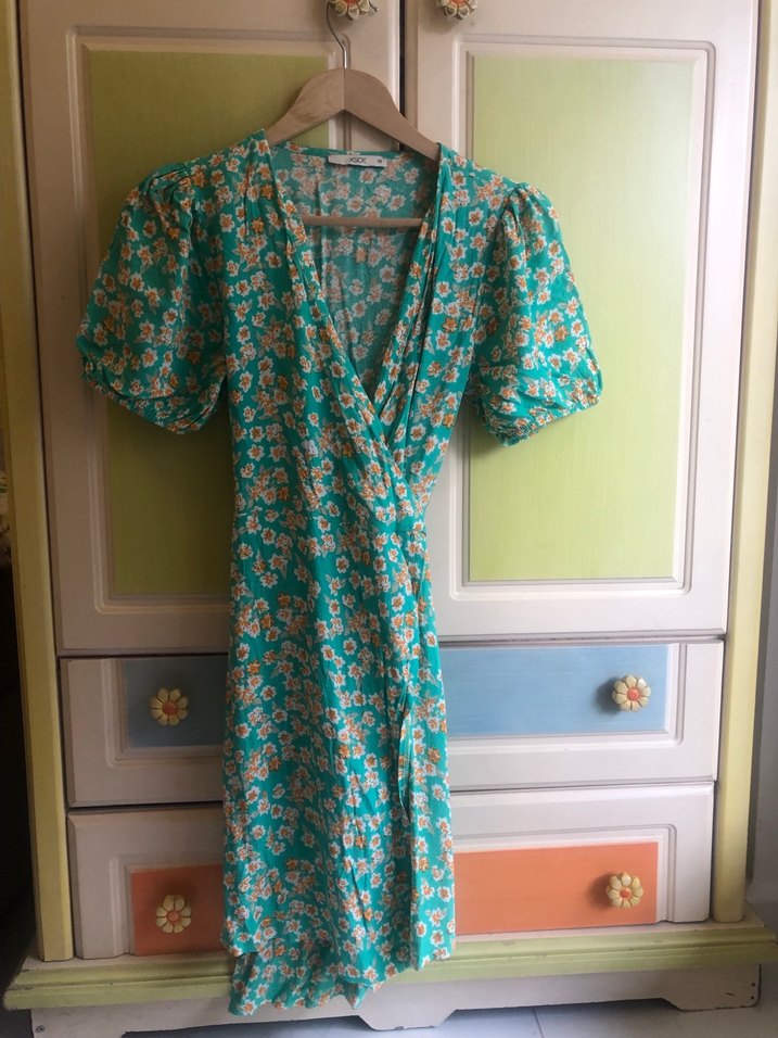 Turkuaz bağlamalı, mini boy, kısa kollu, elbise. V yakalı ve rahat bir tasarıma sahiptir.